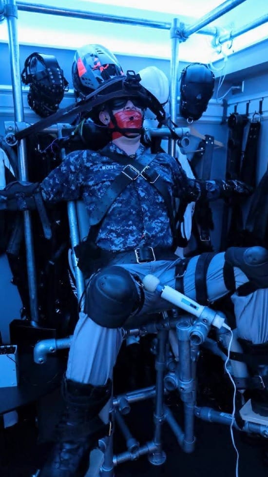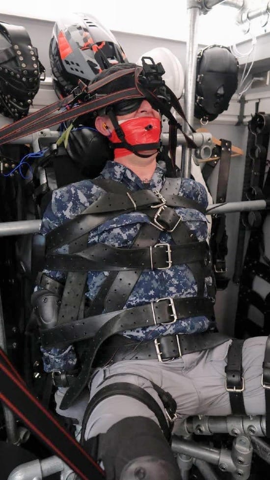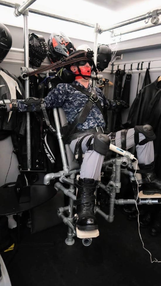 I self-surrendered to PadlockSEA and I suddenly found myself strapped into the bondage chair - arms strapped tightly to firmly mounted metal bars to either side, helmet and head totally immobilized, chest / torso / thighs / knees / boots all fastened securely with leather straps.