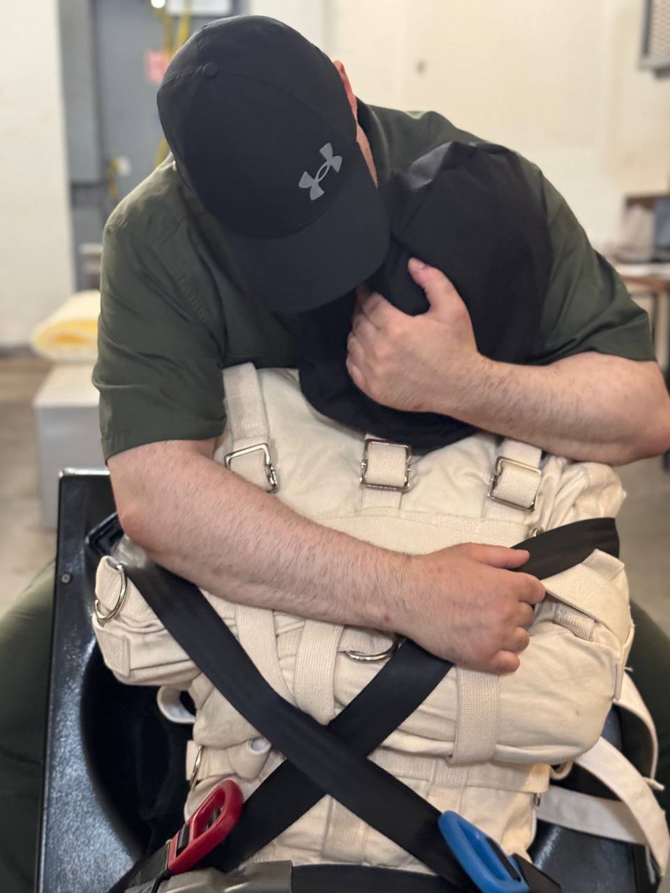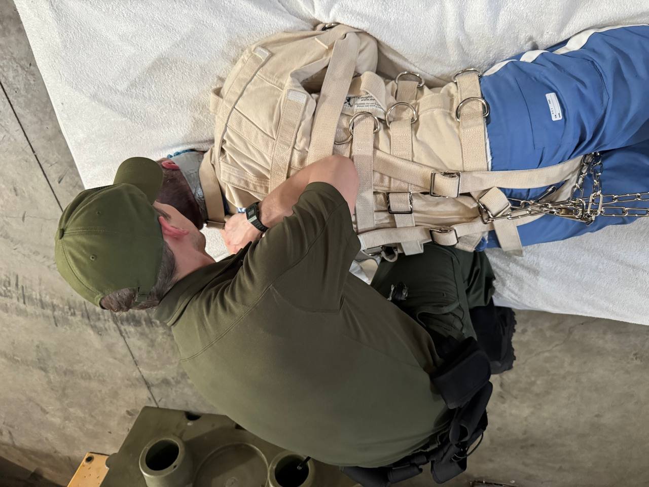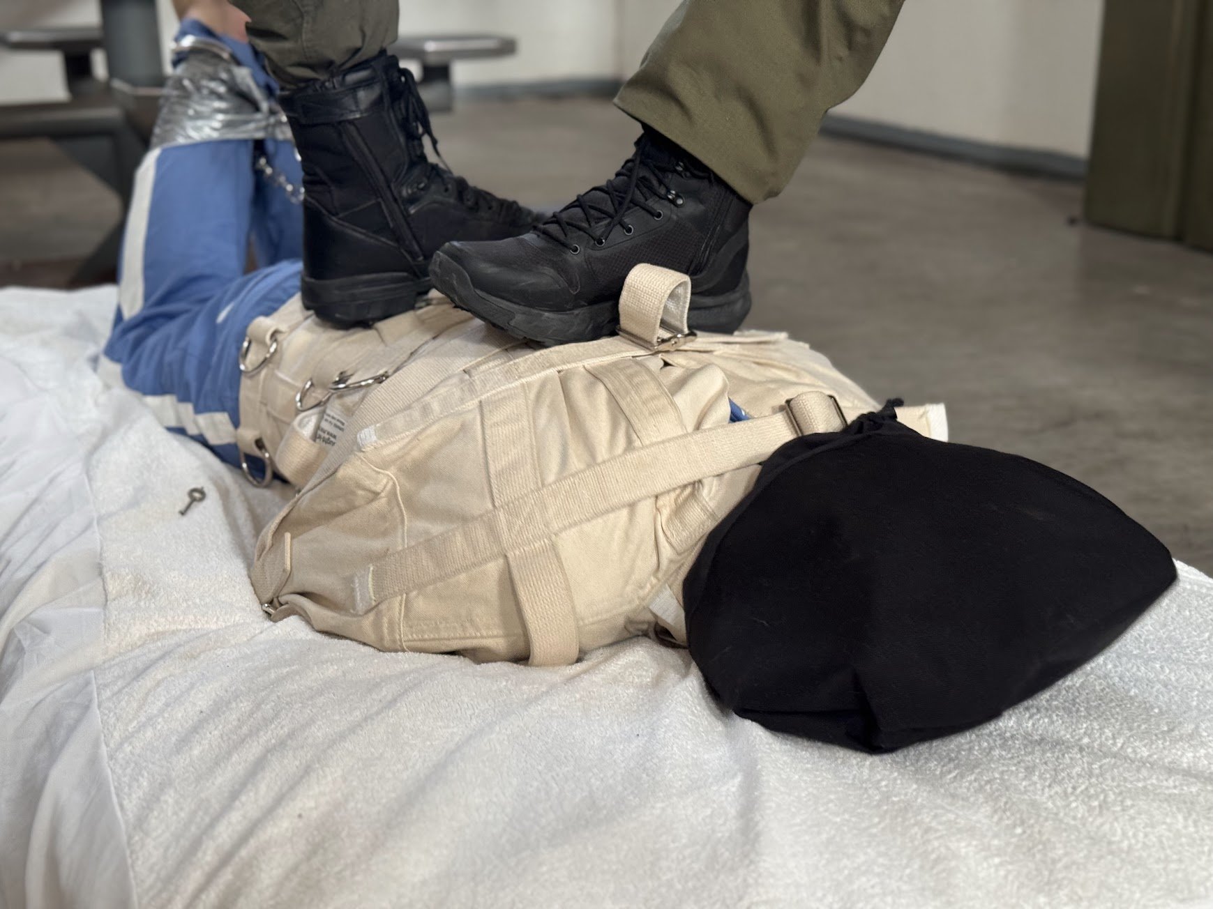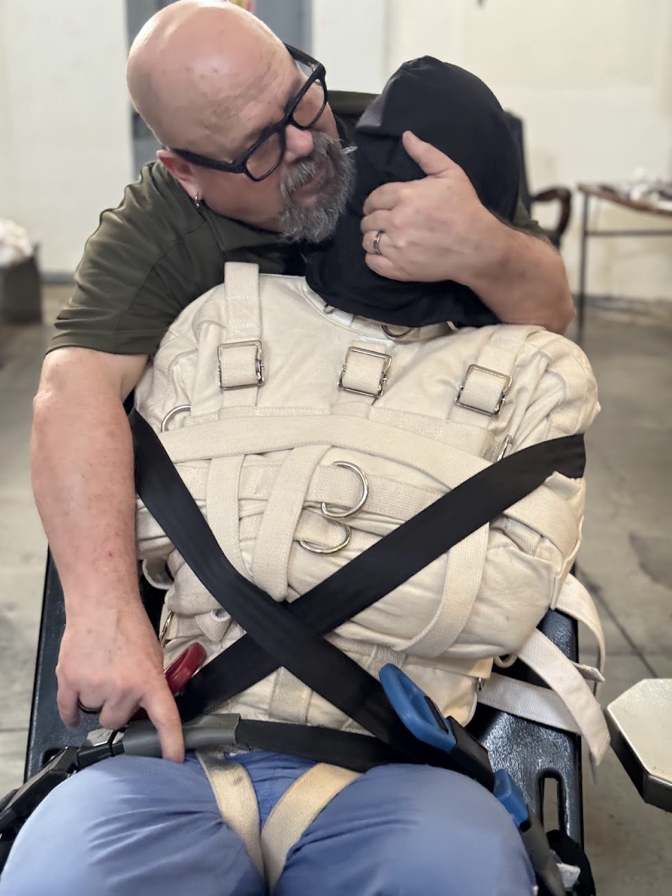 I legitimately tried to fight being put in it. The technique used was masterful and included once one arm was in the jacket, applying handcuffs to keep it in place and secured while you do the other arm. Next thing I know, I’m fully in a straightjacket, on my stomach, legs taped and hog-taped behind me, and a capture hood is thrown over my head.